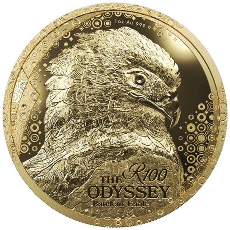 На реверсе изображена голова орла-бательера на фоне африканского орнамента. Вверху надпись: 1oz Au 999.9 (вес и проба золота), внизу: R100 THE ODYSSEY Bateleur Eagle (номинал, серия, орел).