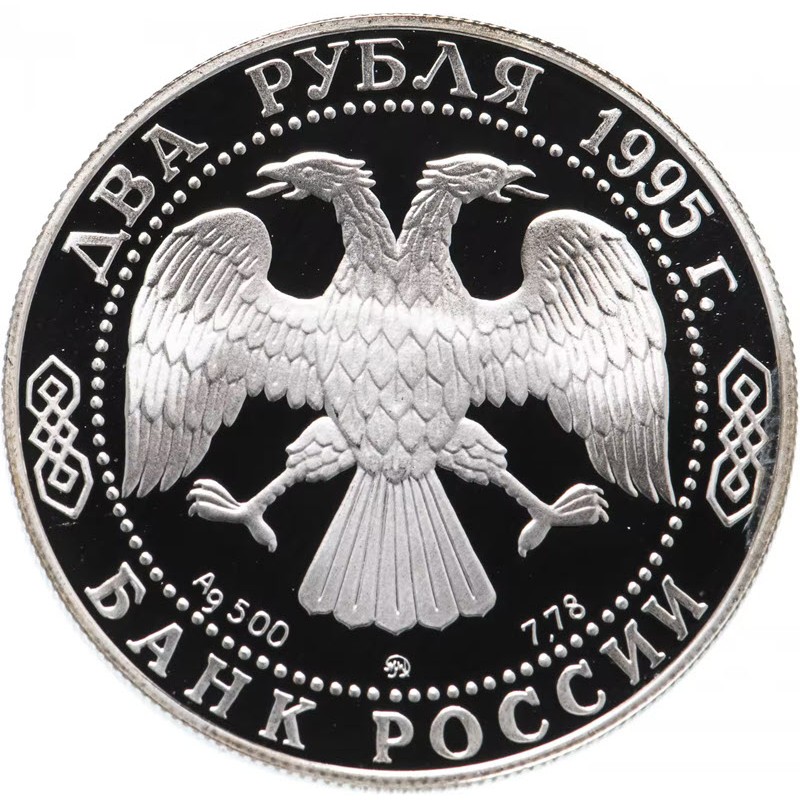 На аверсе изображена эмблема Банка России (двуглавый орел с опущенными крыльями), под ним надпись: Ag 500 ММД 7.78 (вес и проба серебра, монограмма Московского монетного двора). Вдоль канта надпись: ДВА РУБЛЯ 1995 г. БАНК РОССИИ (номинал, год чеканки, банк).