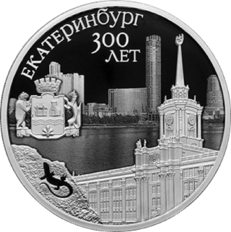 рельефные изображения здания администрации и герба Екатеринбурга, а также камня с ящеркой на фоне выполненной в технике лазерного матирования панорамы города; вверху – рельефные надписи: слева по окружности – «ЕКАТЕРИНБУРГ», под ней в две строки – «300 ЛЕТ».