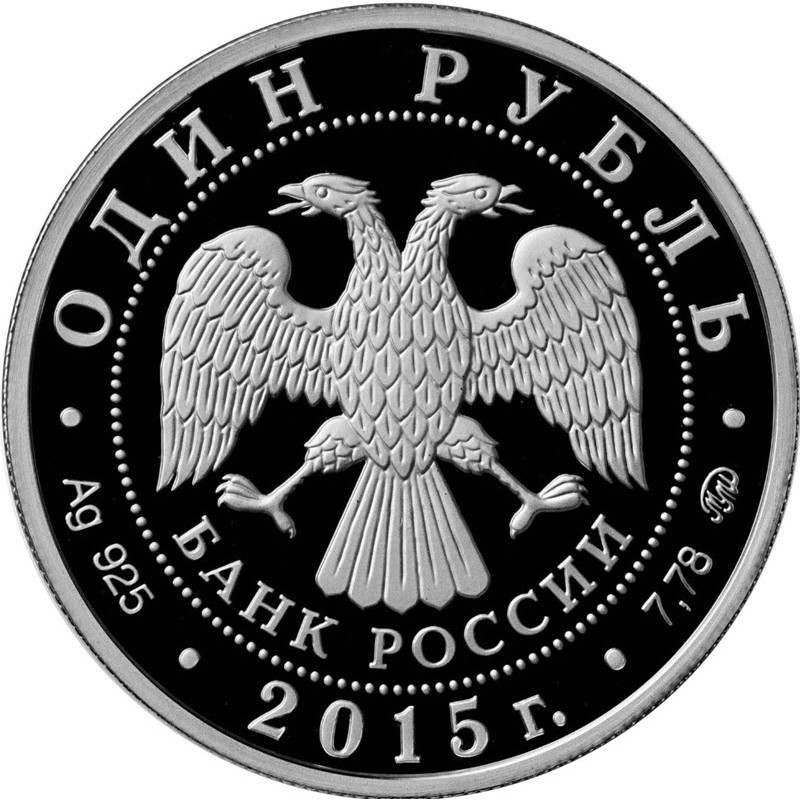 На аверсе изображена эмблема Банка России (двуглавый орел с опущенными крыльями, под ним надпись: БАНК РОССИИ). Вдоль канта надпись: ОДИН РУБЛЬ • Ag 925 • 2015 г. • 7,78 ММД • (номинал, вес и проба серебра, год чеканки, монограмма Московского монетного двора).