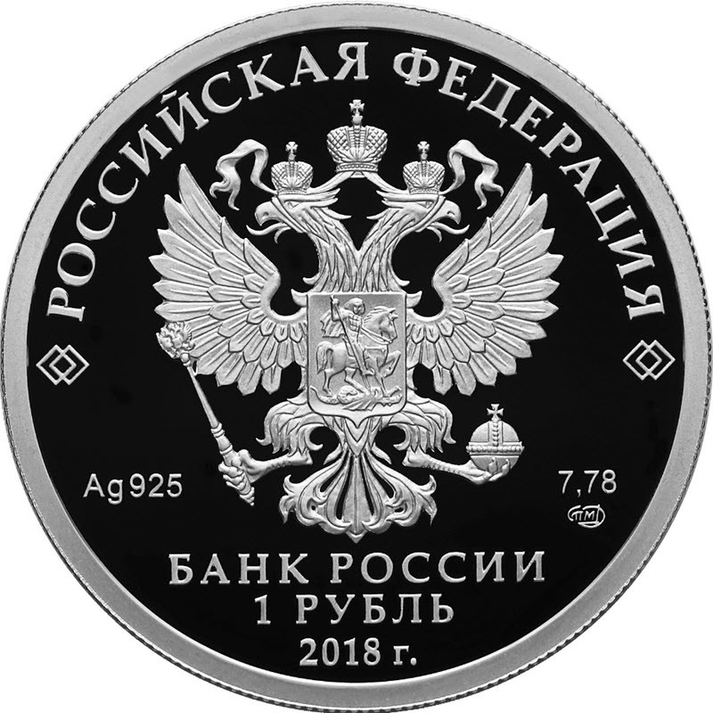 На аверсе рельефное изображение Государственного Герба Российской Федерации. Над ним вдоль канта надпись: РОССИЙСКАЯ ФЕДЕРАЦИЯ. Герб разделяет надпись: Ag 925 7,78 СПМД (вес и проба серебра, знак монетного двора). Внизу надпись в три строки: БАНК РОССИИ  1 РУБЛЬ 2018 г. (банк, номинал, год чеканки).