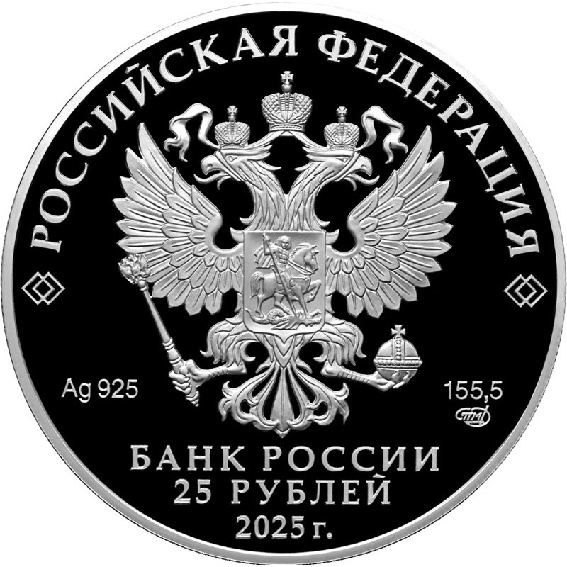 На аверсе в центре — рельефное изображение Государственного герба Российской Федерации, вверху вдоль канта надпись: РОССИЙСКАЯ ФЕДЕРАЦИЯ, обрамленная с обеих сторон сдвоенными ромбами, внизу под гербом надпись: Ag 925 155,5 СПМД (вес и проба серебра, монограмма монетного двора), ниже надпись в три строки: БАНК РОССИИ 25 РУБЛЕЙ 2025 г. (банк, номинал, год чеканки).