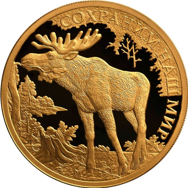 на зеркальном поле диска – рельефное изображение лося, поедающего ветку дерева, вверху и справа вдоль канта – надпись: "СОХРАНИМ НАШ МИР".