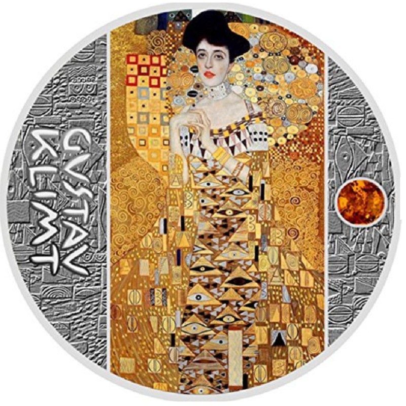 Серебряная монета, посвященная одной из известных картин Густава Климта «Золотая Адель». Монета инкрустирована янтарем. Поставляется в футляре с сертификатом подлинности.