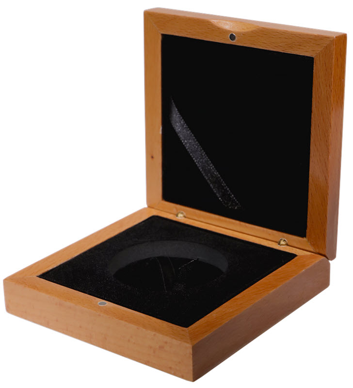 Подарочный деревянный футляр желтого цвета для монет с капсулой диаметром 44 мм. Наружный размер: 90 Х 90 Х 25 мм. Флокированный ложемент черного цвета: 44 мм, глубина 6 мм.