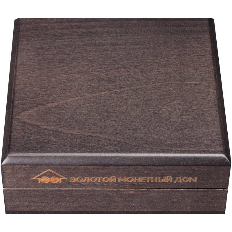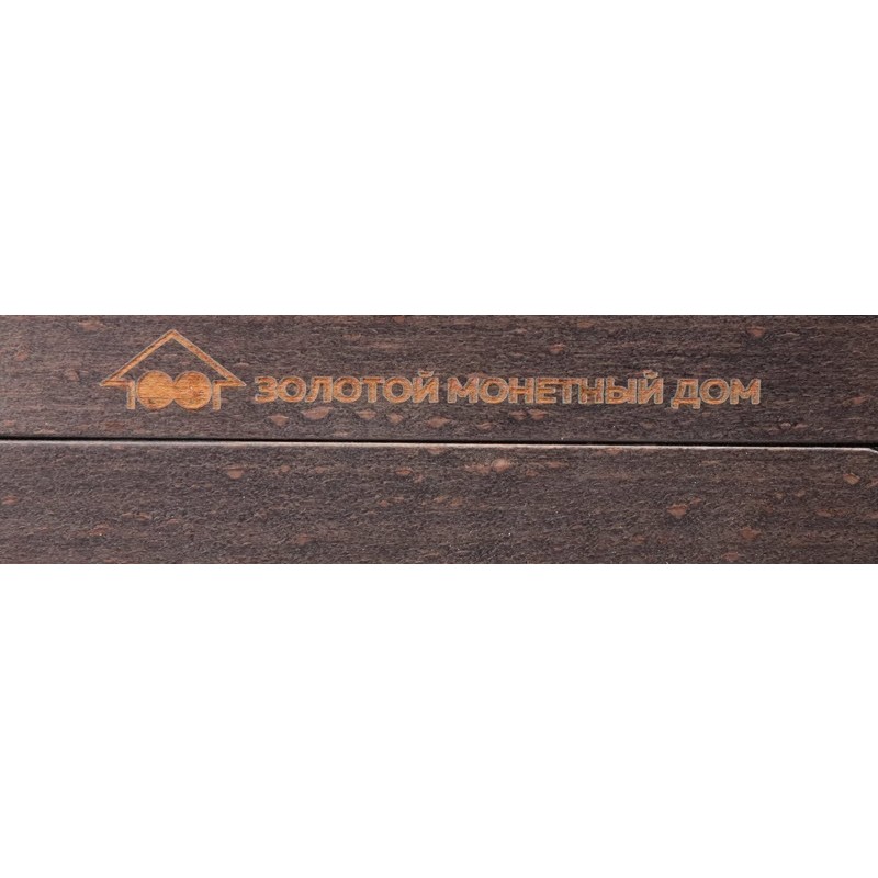 Подарочный деревянный футляр для двух монет. На торце крышки надпись: ЗОЛОТОЙ МОНЕТНЫЙ ДВОР.